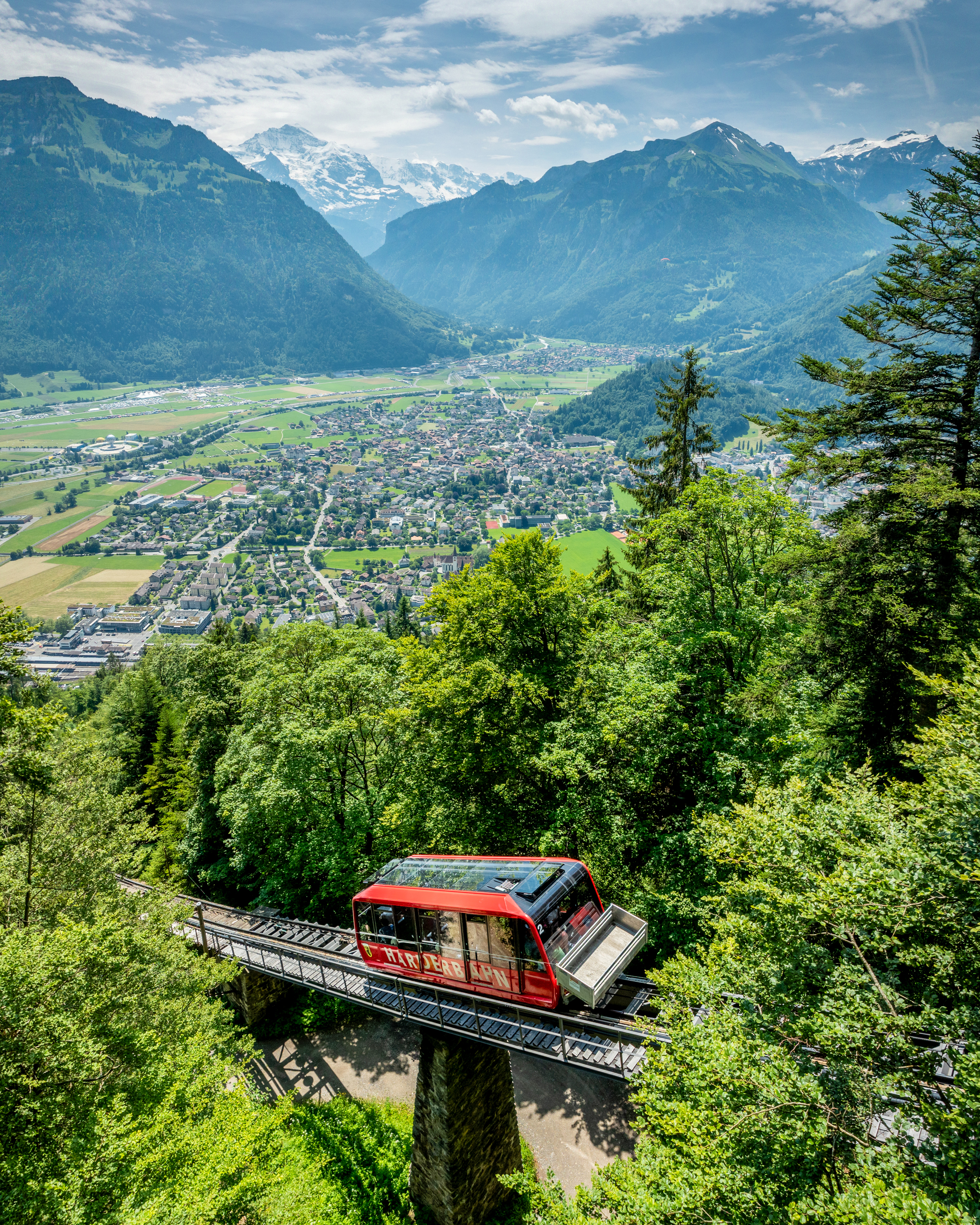 The valley station of the Harder Railway is just 500 meters from the train station Interlaken Ost. From there, the panoramic funicular takes your clients to the Harder Kulm in just 10 minutes. ​